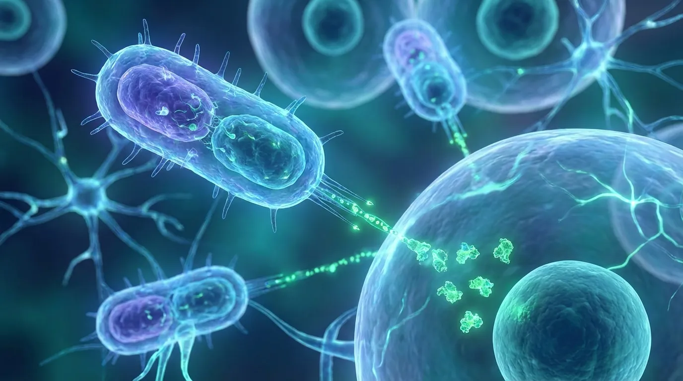 Представь себе, что внутри каждой твоей клетки — сложнейшей биохимической фабрики — вдруг появляются «посланники» от бактерий, которые начинают перенастраивать её работу. Эти белки могут влиять на экспрессию генов, сигнальные пути, клеточный метаболизм и даже программировать реакции иммунитета. Это не просто влияние на «окружающую среду» клетки, это прямое вторжение в её внутреннюю кухню.