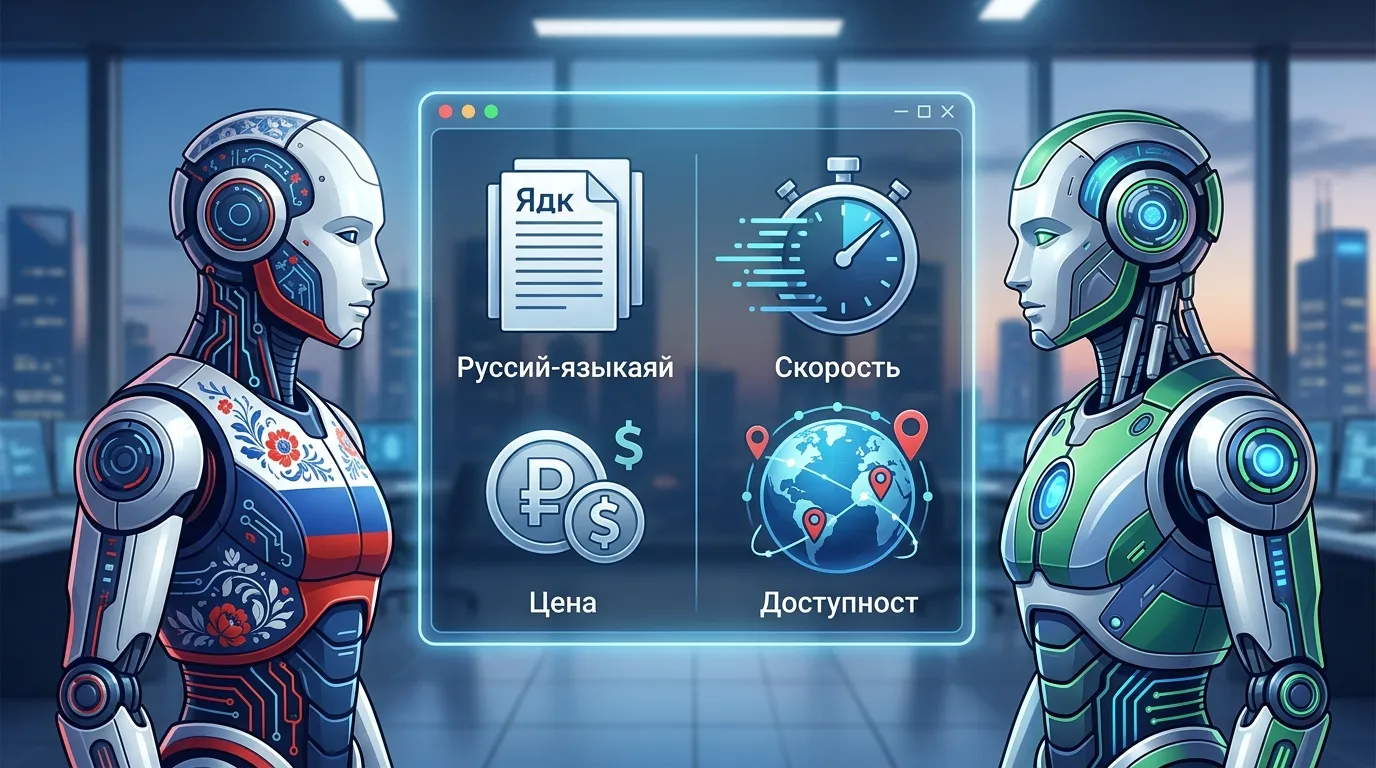 Подробный гайд по выбору между YandexGPT и ChatGPT в 2026 году. Сравнение по русскому языку, скорости, цене и доступности. Когда российский ИИ лучше.